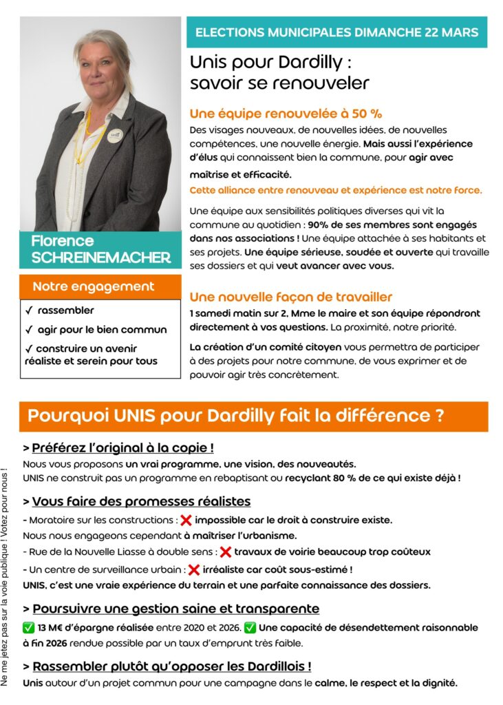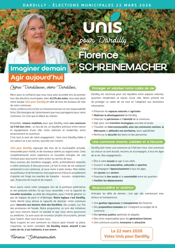 Unis pour Dardilly, c’est une équipe renouvelée à 50%, engagée et proche de vous. Merci aux 42,5 % d’électeurs qui nous ont déjà fait confiance Nous continuons avec la même énergie, forts de notre expérience et tournés vers l’avenir. Notre priorité : rassembler, agir pour le bien commun et construire un avenir serein pour tous. Une équipe de terrain, à l’écoute, qui travaille avec sérieux, transparence et efficacité. Ici, pas de logique de parti. Ici, notre logique, c’est Dardilly. Ensemble, faisons la différence ce dimanche 22 mars.