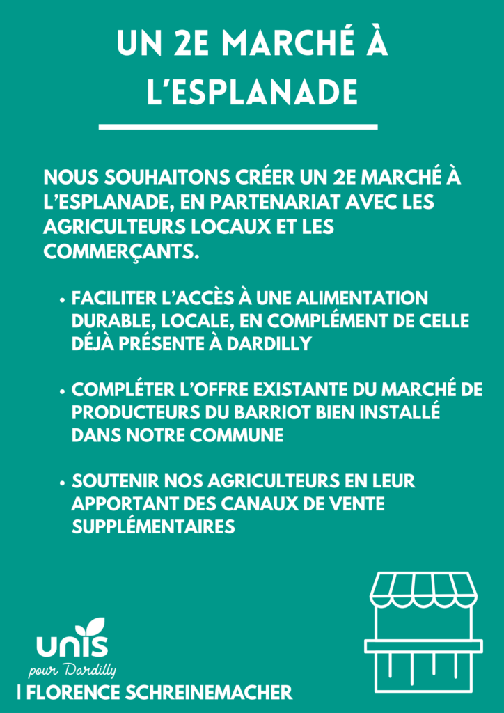 Un marché sera créé à L’Esplanade avec les agriculteurs et les commerçants. Il sera complémentaire du marché du Barriot, bien installé à Dardilly. Objectifs : renforcer l’offre existante, ouvrir de nouvelles débouchées aux agriculteurs et faciliter votre accès à une alimentation saine et locale. Ce projet s’inscrit dans la continuité du soutien que nous apportons à nos agriculteurs (8 exploitations à Dardilly).