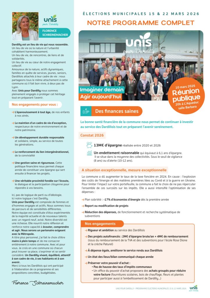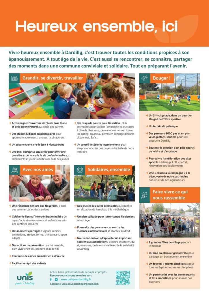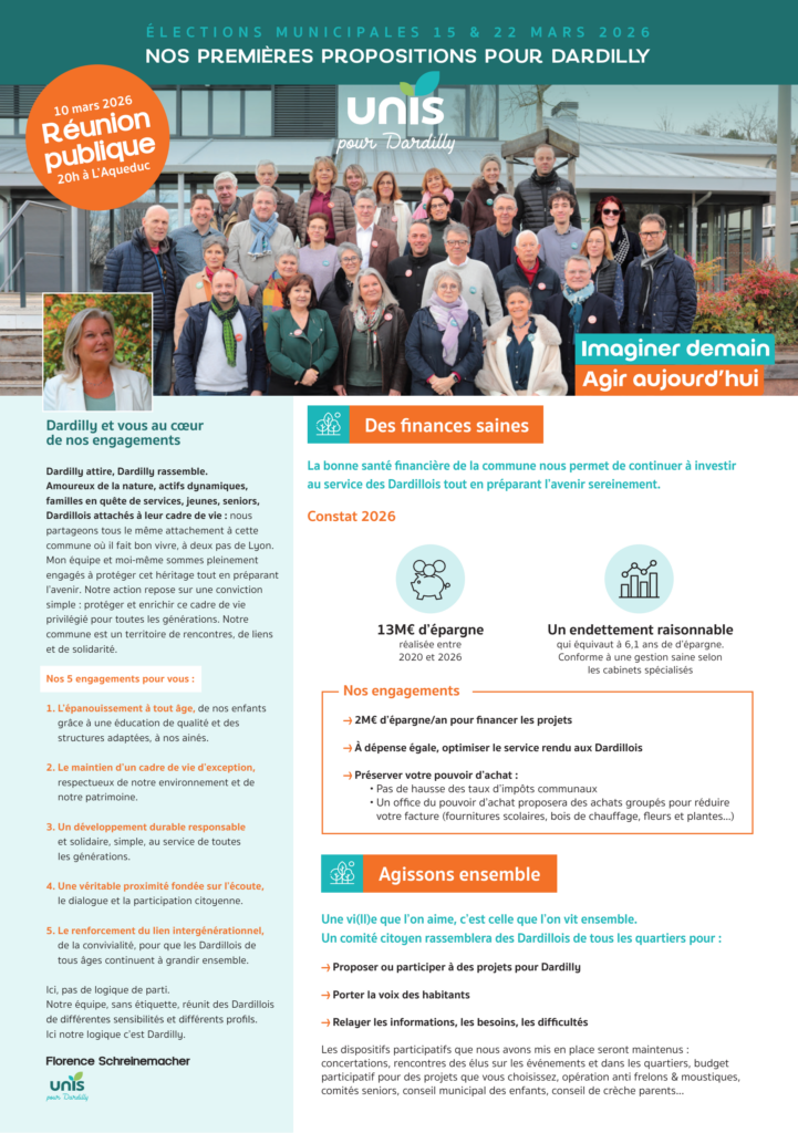 Nos premières propositions pour Dardilly arrivent chez vous cette semaine Découvrez dès maintenant la 4ᵉ page en avant-première chaque jour sur unispourdardilly.fr, ainsi que sur nos pages Facebook et Instagram. A l’honneur aujourd’hui : bien vivre heureux ensemble à Dardilly, entre moments partagés et solidarité. En plaçant l’humain au cœur des priorités. Merci à tous les Dardillois qui contribuent à enrichir ce programme par leurs idées et nos échanges sur le terrain. Continuons à construire ensemble l’avenir, tous unis à Dardilly. PS : le programme complet sera dévoilé en mars.