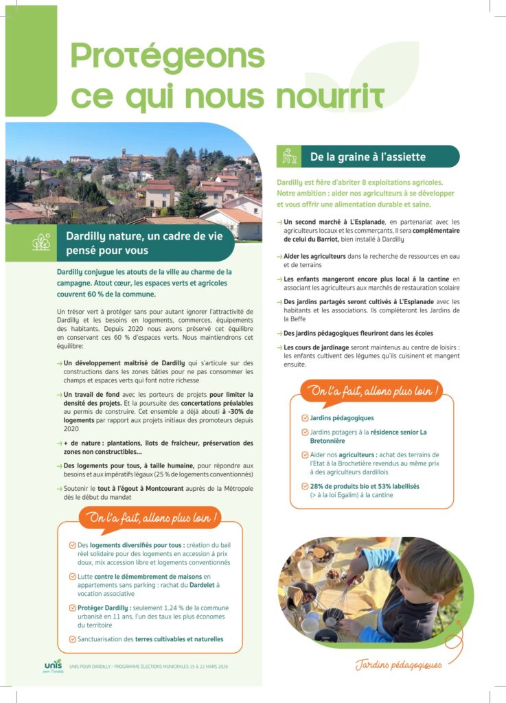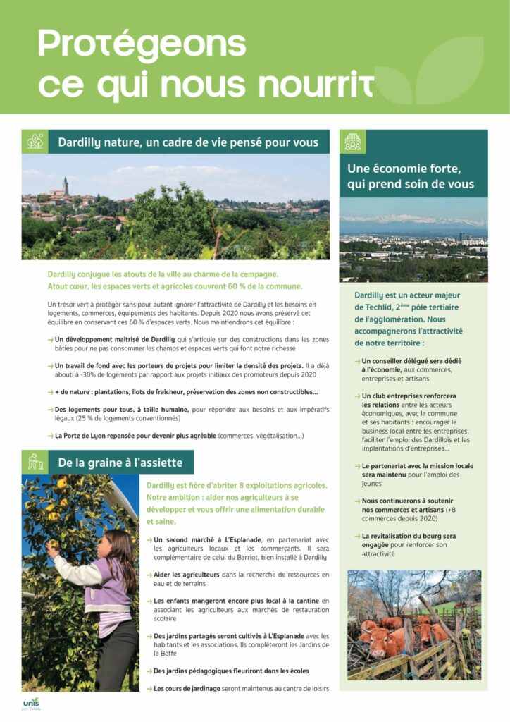 Notre programme pour Dardilly est actuellement distribué dans vos boites-aux-lettres. Découvrez en avant-première les pages dédiées à notre cadre de vie : la préservation de nos espaces naturels et agricoles qui représentent 60% de Dardilly Le développement maîtrisé de Dardilly L’économie, et le soutien aux agriculteurs, entreprises et commerces de proximité Nos actions pour le climat et une alimentation durable Rdv dimanche pour les propositions consacrées au vivre heureux ensemble entre sport et culture pour tous, solidarité, enfance, jeunesse, seniors… Cliquez sur l’image pour afficher