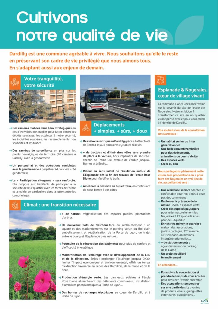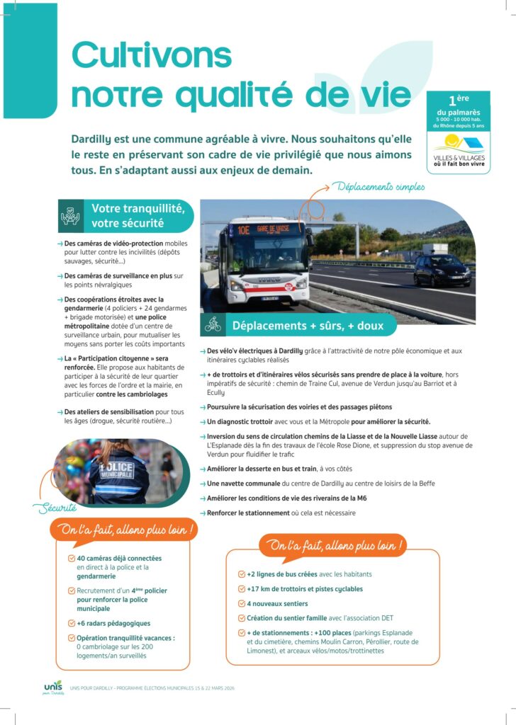 Dardilly est une commune agréable à vivre. Nous souhaitons qu’elle le reste en préservant son cadre de vie privilégié que nous aimonstous. En s’adaptant aussi aux enjeux de demain. Découvrez ici nos propositions pour préserver et encore améliorer notre cadre de vie : – sécurité– transports et déplacements doux– vos quartiers plus agréables
