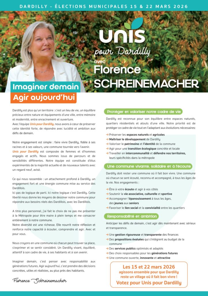 Unis pour Dardilly, c’est une équipe renouvelée à 50%, engagée et proche de vous. Merci aux 42,5 % d’électeurs qui nous ont déjà fait confiance Nous continuons avec la même énergie, forts de notre expérience et tournés vers l’avenir. Notre priorité : rassembler, agir pour le bien commun et construire un avenir serein pour tous. Une équipe de terrain, à l’écoute, qui travaille avec sérieux, transparence et efficacité. Ici, pas de logique de parti. Ici, notre logique, c’est Dardilly. Ensemble, faisons la différence ce dimanche 22 mars.