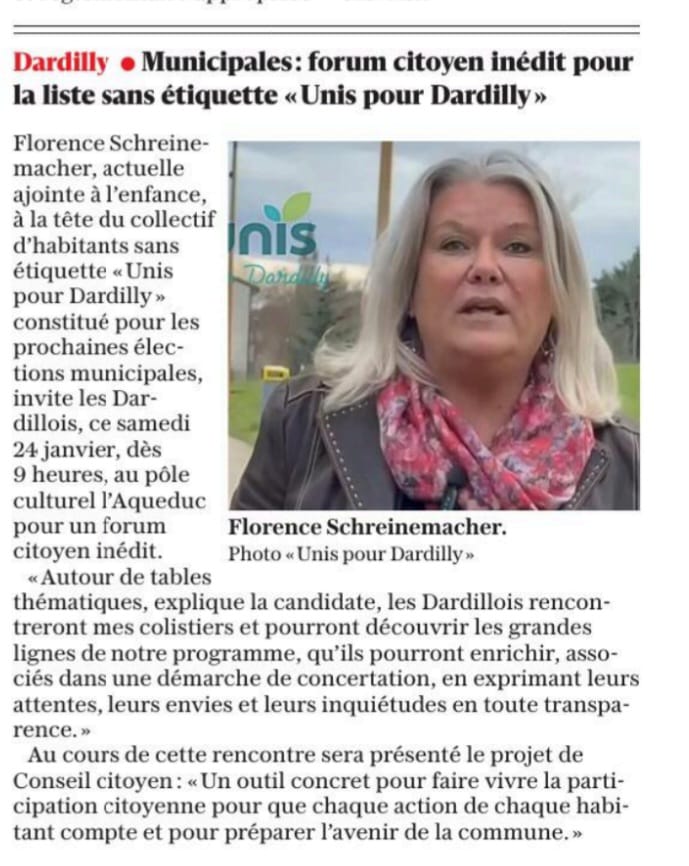 FORUM Citoyen : Rdv le 24 janvier. Aqueduc, Salle César et Séraphine. Accès libre à partir de 9h jusqu’à 12h. Notre équipe vous accueille, présente ses premiers projets et vous écoute lors d’une matinée qui vous est dédiée pour préparer l’avenir de notre commune. Au programme : – Mobilité, sécurité, cadre de vie, transition… – Solidarités, jeunesse, enfance… – Sport, Culture Vie associative, citoyenneté… – Attractivité du territoire, économie, urbanisme, finances, emploi… Et nous vous proposons une table d’activités pour vos enfants. Nous avons hâte de vous retrouver. Merci au Progrès pour la mise en lumière de cette réunion citoyenne inédite.