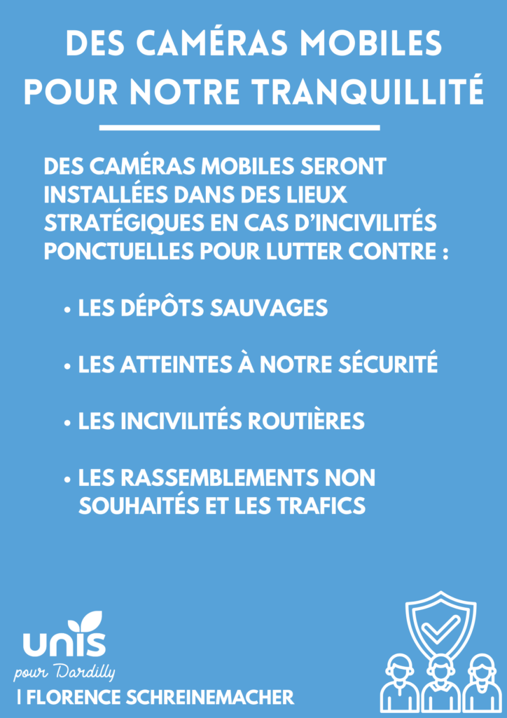 Chaque jour retrouvez une proposition pour Dardilly. Sécurité. Des caméras mobiles seront installées sur les lieux en cas d’incivilités ponctuelles. Un système moins couteux et complémentaire des caméras fixes installées dans les points stratégiques (40 caméras à Dardilly). Cette nouveauté s’inscrit dans la continuité des actions déjà en place que nous poursuivrons pour notre sécurité et notre tranquillité à tous.