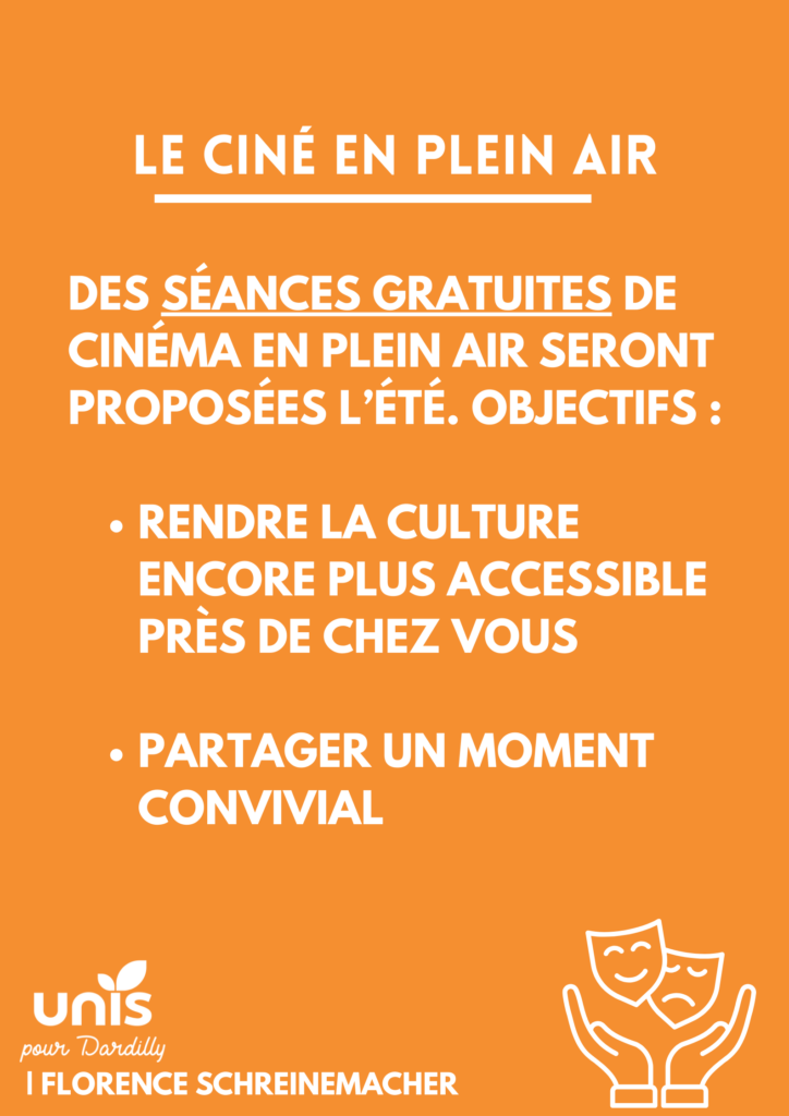 Une culture pour tous, propice à l’épanouissement et la convivialité. Des séances de ciné en plein air seront proposées l’été. Nous poursuivrons les actions que nous avons mises en place depuis 2020 en faveur d’une culture toujours plus accessible, près de chez vous.