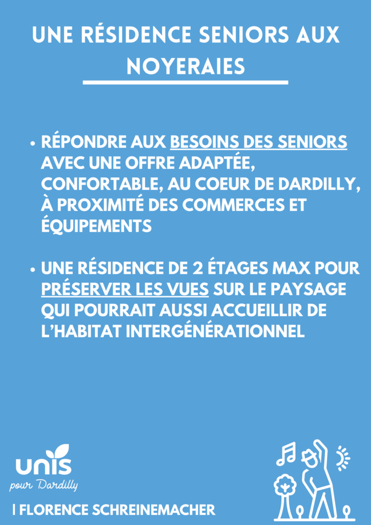 Aimer nos ainés. Une résidence seniors s’installera aux Noyeraies, une fois que l’école, devenue obsolète, aura déménagé dans le groupe scolaire Rose Dione, plus grand et confortable avenue de Verdun. La résidence, de 2 étages maximum, viendra répondre aux besoins croissants des seniors, dans un contexte de vieillissement de la population à l’échelle nationale. Elle complètera les dispositifs que nous avons mis en place et que nous souhaitons poursuivre en faveur de nos aînés.