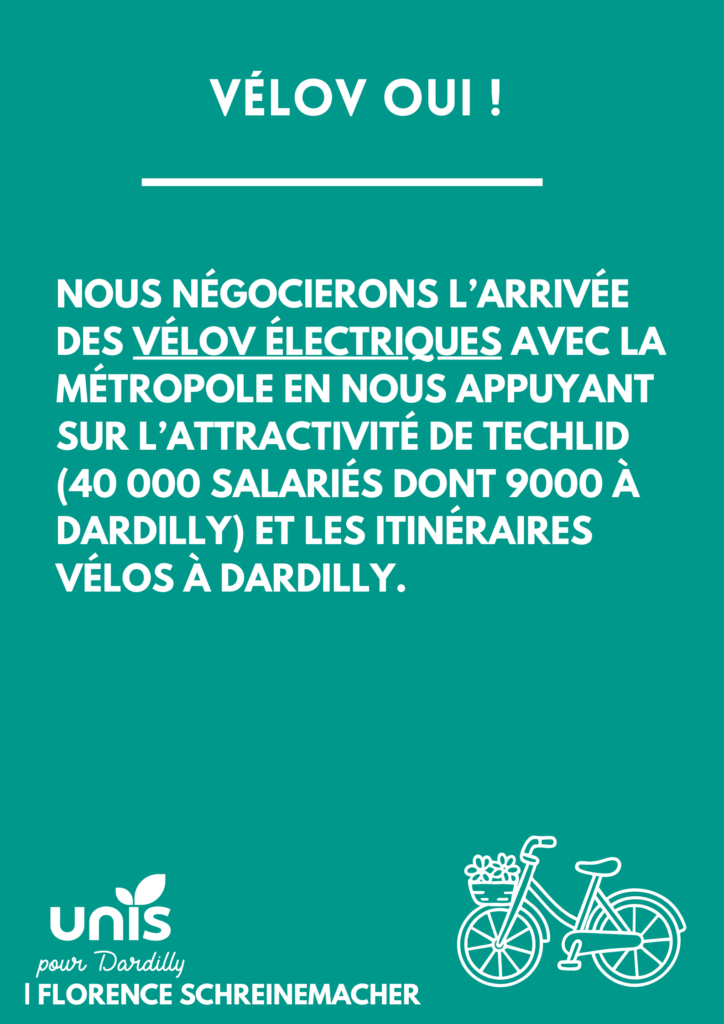 Nous négocierons l’arrivée de Vélov électriques à Dardilly en nous appuyant sur l’attractivité de Techlid, l’arrivée récente du service à Champagne. Autre atout de taille : les nombreux aménagements cyclables que nous créés depuis 2020 et que nous souhaitons poursuivre, sans prendre de place à la voiture qui reste essentielle pour nombre d’entre nous. En bref, un partage de la route en bonne intelligence.