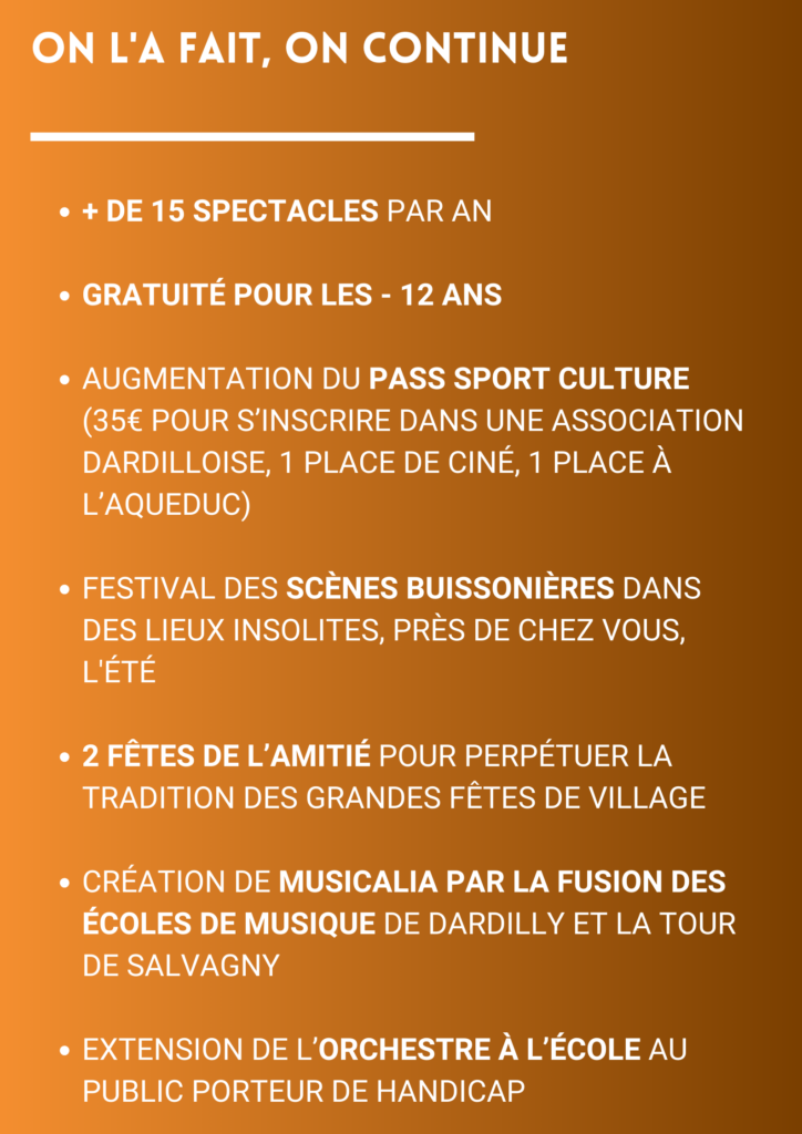 Une culture pour tous, propice à l’épanouissement et la convivialité. Des séances de ciné en plein air seront proposées l’été. Nous poursuivrons les actions que nous avons mises en place depuis 2020 en faveur d’une culture toujours plus accessible, près de chez vous.