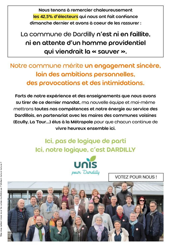 Unis pour Dardilly, c’est une équipe renouvelée à 50%, engagée et proche de vous. Merci aux 42,5 % d’électeurs qui nous ont déjà fait confiance Nous continuons avec la même énergie, forts de notre expérience et tournés vers l’avenir. Notre priorité : rassembler, agir pour le bien commun et construire un avenir serein pour tous. Une équipe de terrain, à l’écoute, qui travaille avec sérieux, transparence et efficacité. Ici, pas de logique de parti. Ici, notre logique, c’est Dardilly. Ensemble, faisons la différence ce dimanche 22 mars.